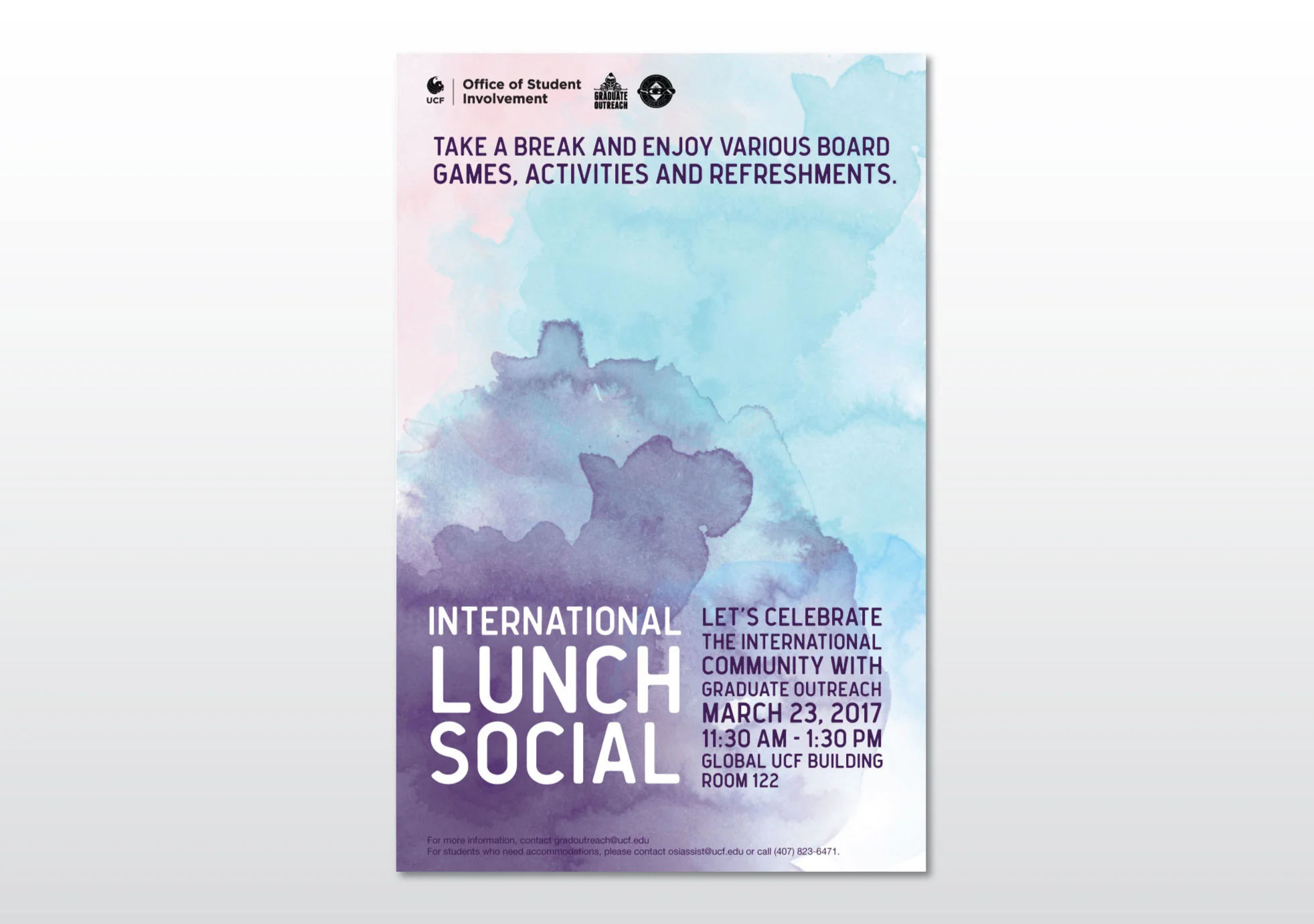 At the Office of Student Involvement my job was to create enticing posters to bring the students to the events hosted by the various organizations within OSI. The following are posters for CAB, VUCF, Graduate Outreach, and Homecoming.